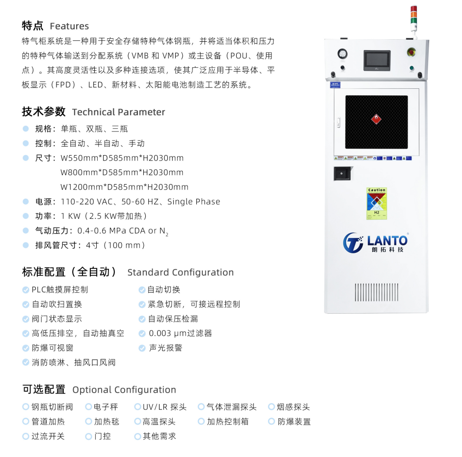LANTO特气柜系统有各种不同规格,材料和配置,以满足您高纯和超高纯应用的要求。